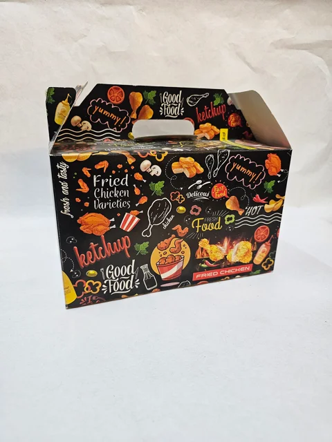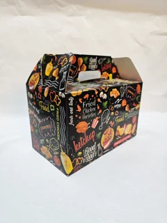 جعبه سوخاری بیرون بر از جنس مقوای ایندربرد خارجی با کیفیت عالی و مقاومت بالا، مناسب بستهبندی انواع سوخاری و فستفودها، دارای طراحی استاندارد برای حمل آسان به همراه حفظ تازگی غذا،