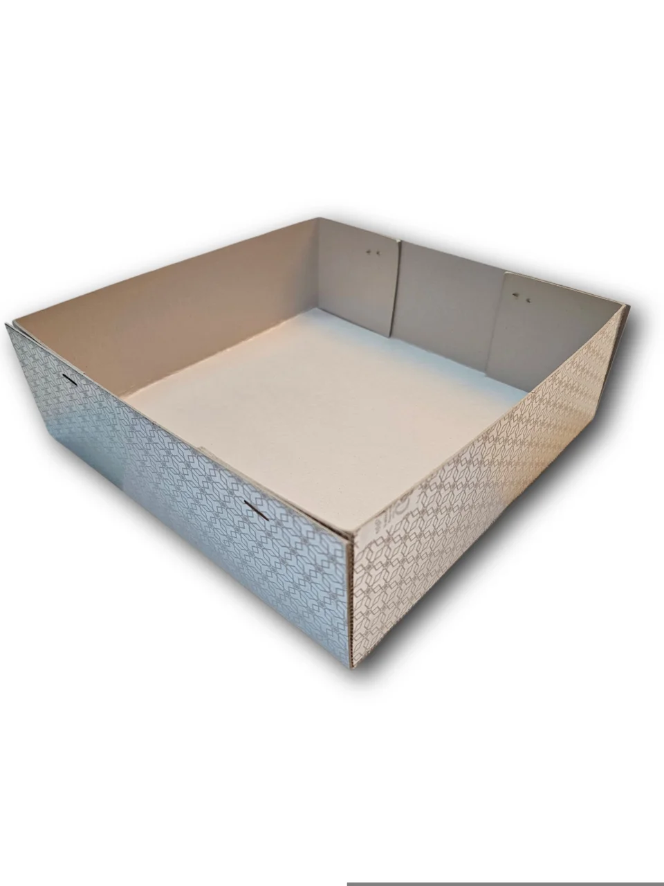 این جعبه با ابعاد استاندارد ۲۳×۲۳ سانتیمتر طراحی شده و مناسب بستهبندی انواع کیک، شیرینی و دسر تا وزن تقریبی یک کیلوگرم میباشد. فرم مربع این محصول باعث قرارگیری بهتر کیک در داخل جعبه شده و از جابهجایی یا آسیب در زمان حمل جلوگیری میکند.
